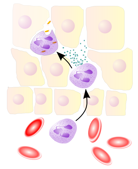 By Bobjgalindo. English: Band neutrophil from a blood smear under a microscope (40x). Español: Neutrófilo en cayado o en banda de un frotis de sangre periférica (40x). Own work. 12 March 2005. Creative Commons Attribution-Share Alike 4.0 International 3.0 Unported, 2.5 Generic, 2.0 Generic and 1.0 Generic license.