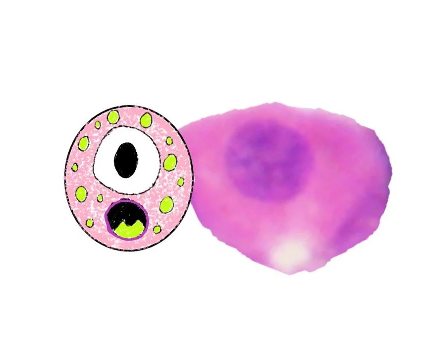 By Mikael Häggström, MD. Signet-ring-cell-like foamy macrophage and normal macrophage. Wright stain. Sample from cerebrospinal fluid. 28 August 2022. Public Domain (CC0 1.0).