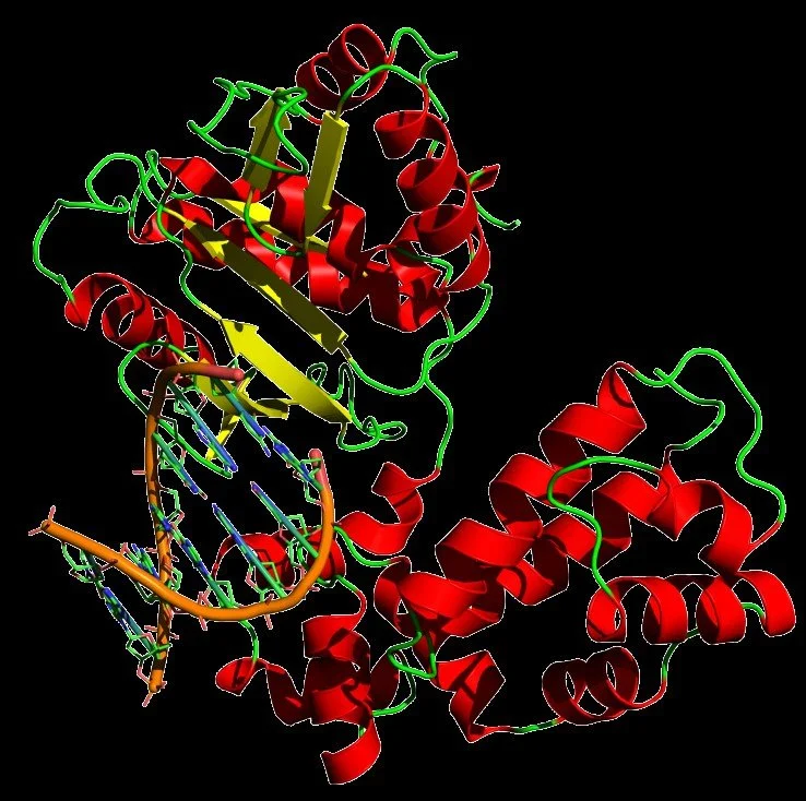 By Yikrazuul. English: structure of Homo sapiens DNA polymerase beta, pdb file 7ICG. A bound DNA is also indicated. 25 July 2009. Creative Commons Attribution-Share Alike 3.0 Unported license.