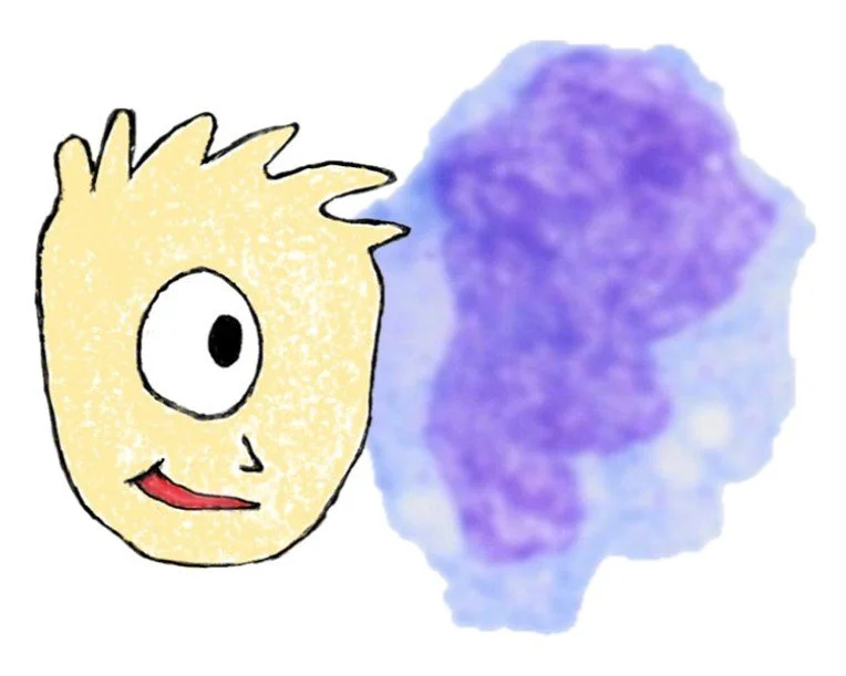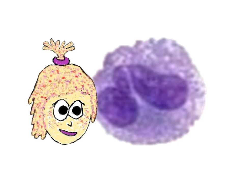 Answer: He is a (head)band neutrophil! A band neutrophil is an immature neutrophil with a curved and not lobular nucleus. Usually there is an increase in the number of these immature neutrophils (called bandemia and representing a “left shift”) in infectious or inflammatory conditions.